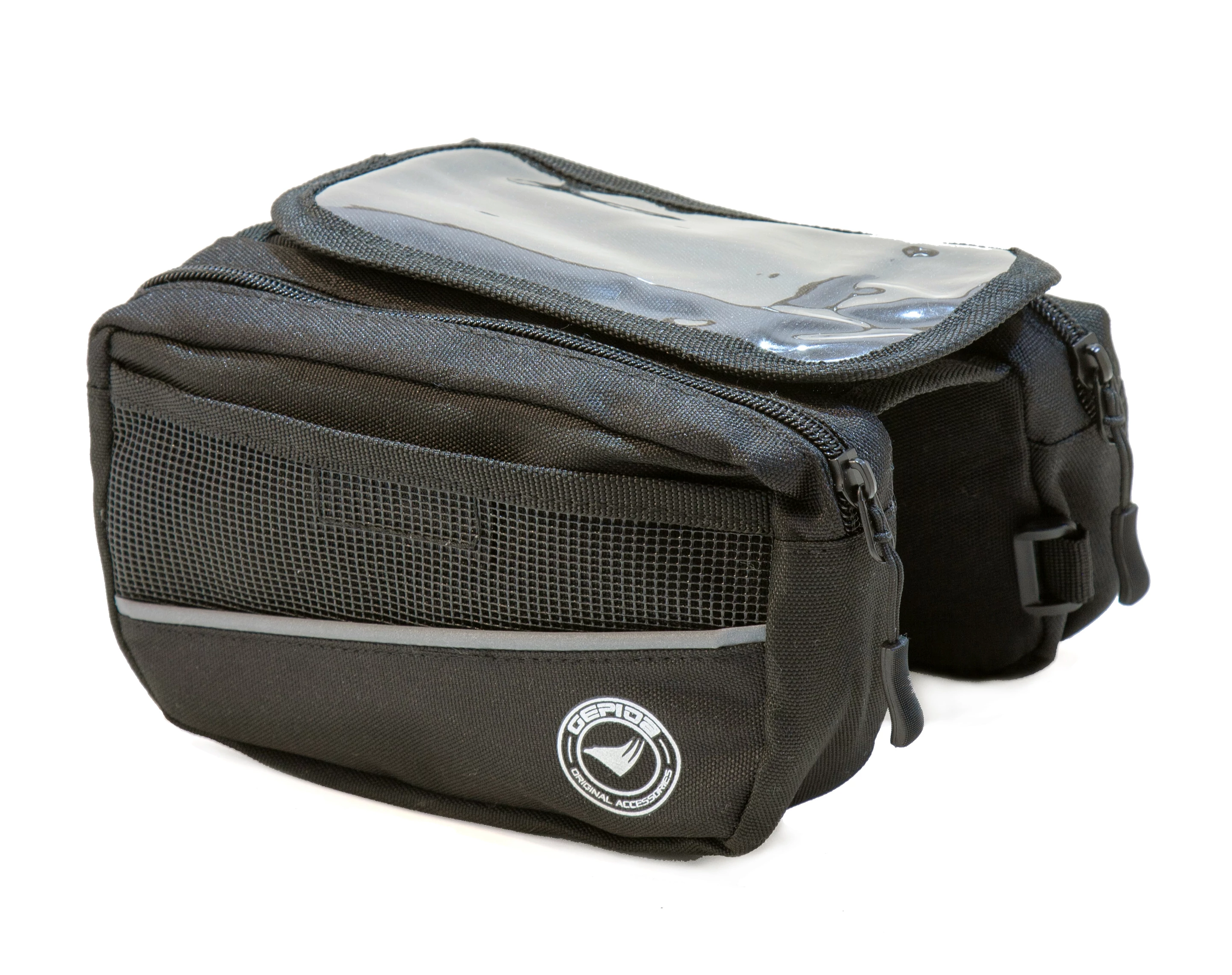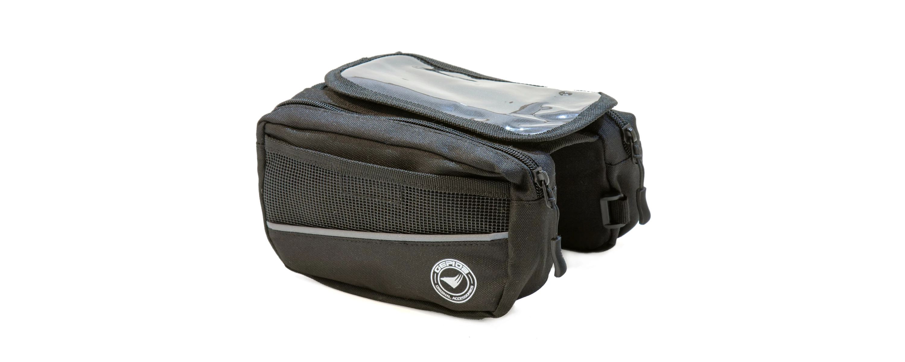 Űrtartalom: 0,9 l, 3M fényvisszaverő szegély, Vízlepergető alapanyag (Polyester 600D), Erősített varrások, Helyet biztosít a kulcsok, pénz és a személyes tárgyak számára, Két oldalzseb belső kis rekesszel, Átlátszó felső rész az okostelefonok számára, 5,5 hüvelykes kijelző méretig, Minden kerékpárra könnyen fel- és leszerelhető
